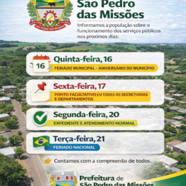 COMUNICADO OFICIAL Informamos à população sobre o funcionamento dos serviços públicos nos próximos dias: Quinta-feira, 16 Feriado municipal... leia mais