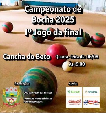 O Conselho Municipal de Desporto (CMD) de São Pedro das Missões, liderado pelo servidor Flávio Garcez, está chegando ao final do 1º Campeonato de Bocha organizado pelo órgão. Além do apoio da prefeitura, o evento também conta com o patrocínio do Sicredi, Cresol, Mercado Avenida e Mercado Bianchini.