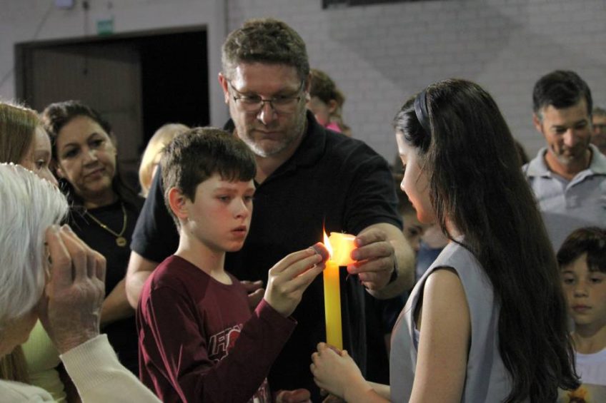 No final da noite, a sobrinha neta de Irmã Adelaide, Luiza Molinari, que representou Ir. Adelaide, entrou com um vela acesa. E a comunidade acendeu suas velas naquela chama. Então o padre e as irmãs invocaram a bênção sobre o povo.