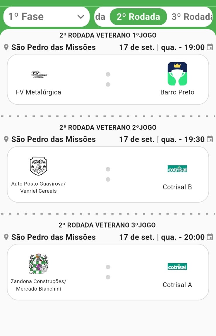 Hoje à noite, a partir das 19h, acontece a segunda rodada na categoria veteranos. Estão programados três jogos para essa noite.