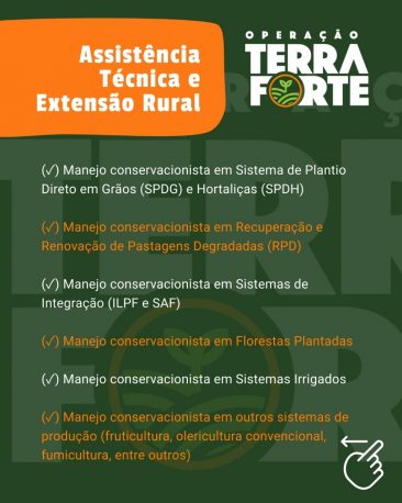 – Assistência Técnica e Extensão Rural (Aters) – diagnóstico, planejamento e execução dos planos de recuperação, com difusão tecnológica para até 150 mil propriedades.