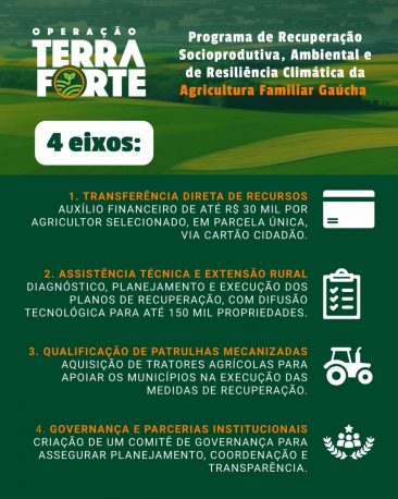 Coordenado pela Secretaria de Desenvolvimento Rural (SDR) e desenvolvido em parceria com a Emater/RS-Ascar, o programa tem como propósito promover a recuperação socioprodutiva e ambiental, além de fortalecer a resiliência climática das Unidades de Produção Familiar (UPFs) da agricultura familiar gaúcha. A iniciativa prevê atendimento direto a 15 mil UPFs e ações de difusão que alcançarão outras 150 mil.