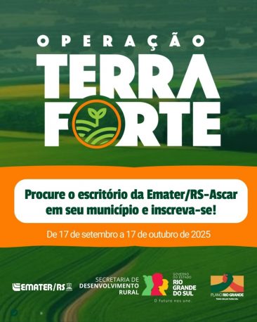 As inscrições para o Programa Operação Terra Forte começaram na quarta-feira (17/9) e seguem até 17 de outubro. Podem participar agricultores familiares, indígenas, quilombolas, assentados da reforma agrária e pecuaristas familiares que possuam Cadastro Nacional da Agricultura Familiar (CAF) ou Declaração de Aptidão ao Pronaf (DAP) ou Declaração de Pecuarista Familiar (DPF) ativos.