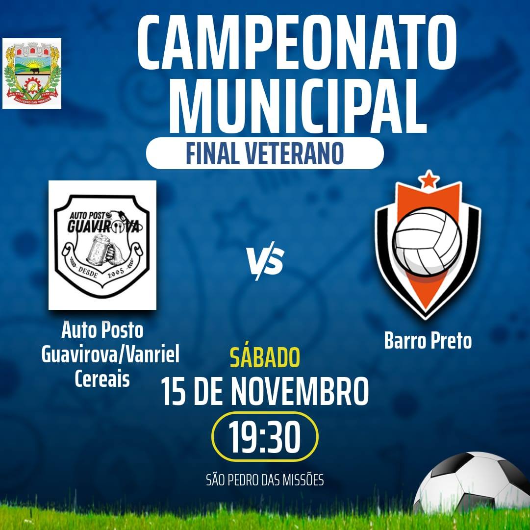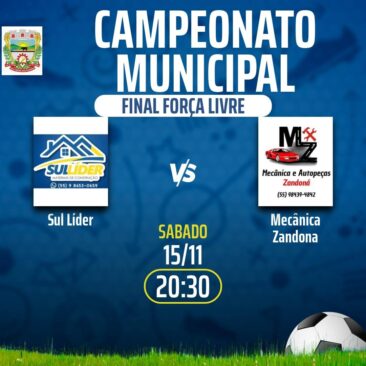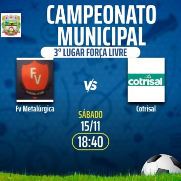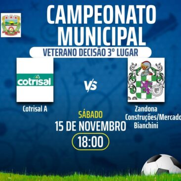 Neste sábado, dia 15 de novembro, a partir das 17h30, acontecerão as finais do nosso evento esportivo. No jogo pelo terceiro lugar na categoria veterano, vão se enfrentar Cotrisal A e Zandoná Construções / Mercado Bianchini. Na categoria força livre, o duelo será entre FV Metalúrgica e Cotrisal. Já na disputa pelo título, a final do veterano vai colocar frente a frente Auto Posto Guavirova / Vanriel Cereais e Barro Preto.