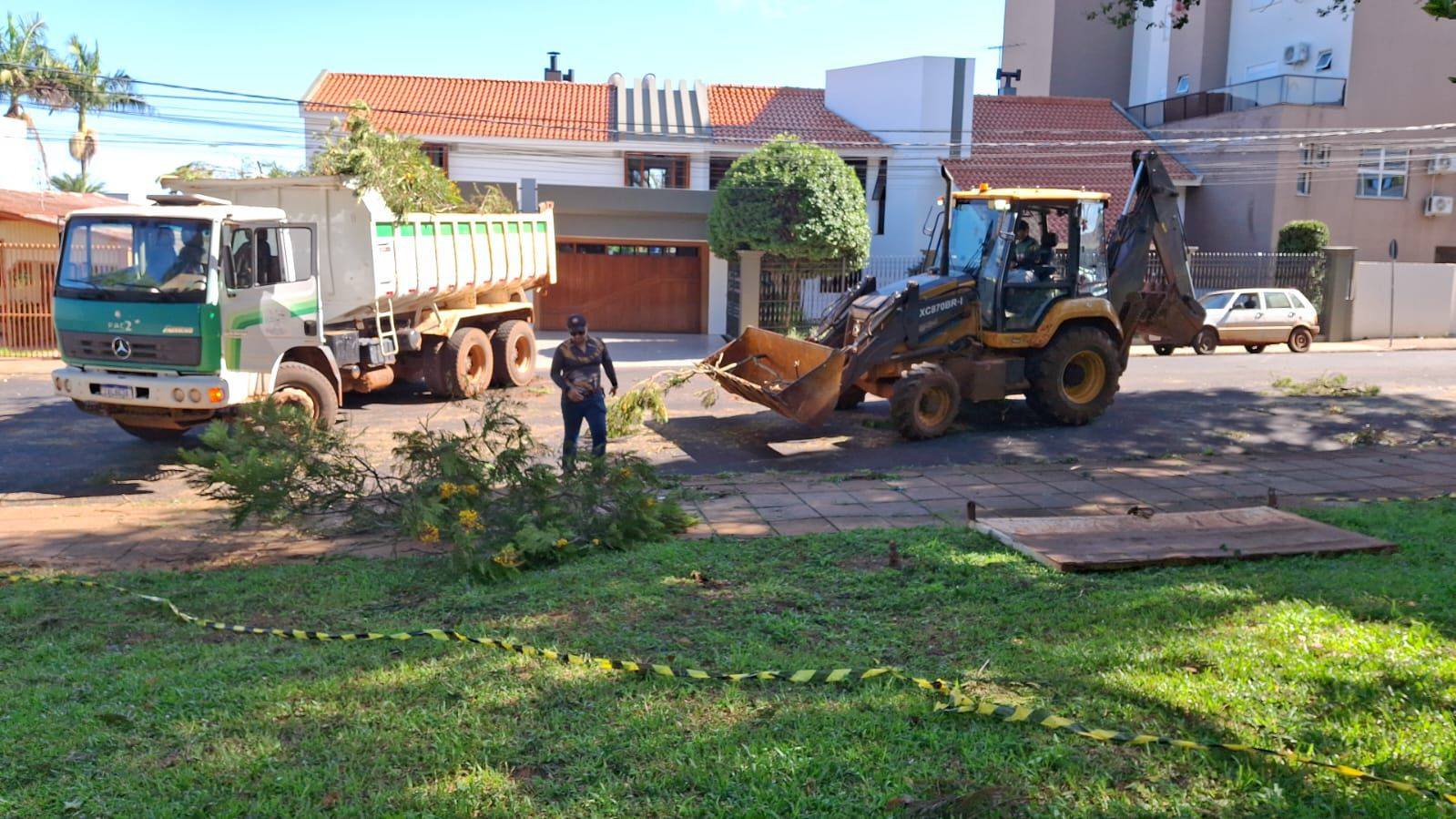 Foram disponibilizados servidores e maquinário para atuar na remoção de galhos, limpeza de áreas públicas e poda de árvores comprometidas pelo vendaval.