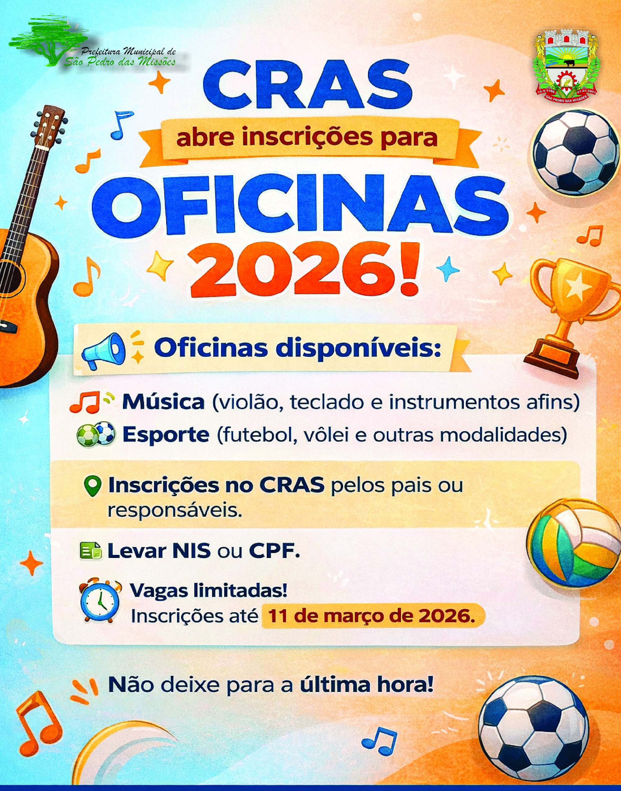 O Centro de Referência de Assistência Social (CRAS) informa que estão abertas as inscrições para as oficinas do Serviço de Convivência e Fortalecimento de Vínculos.