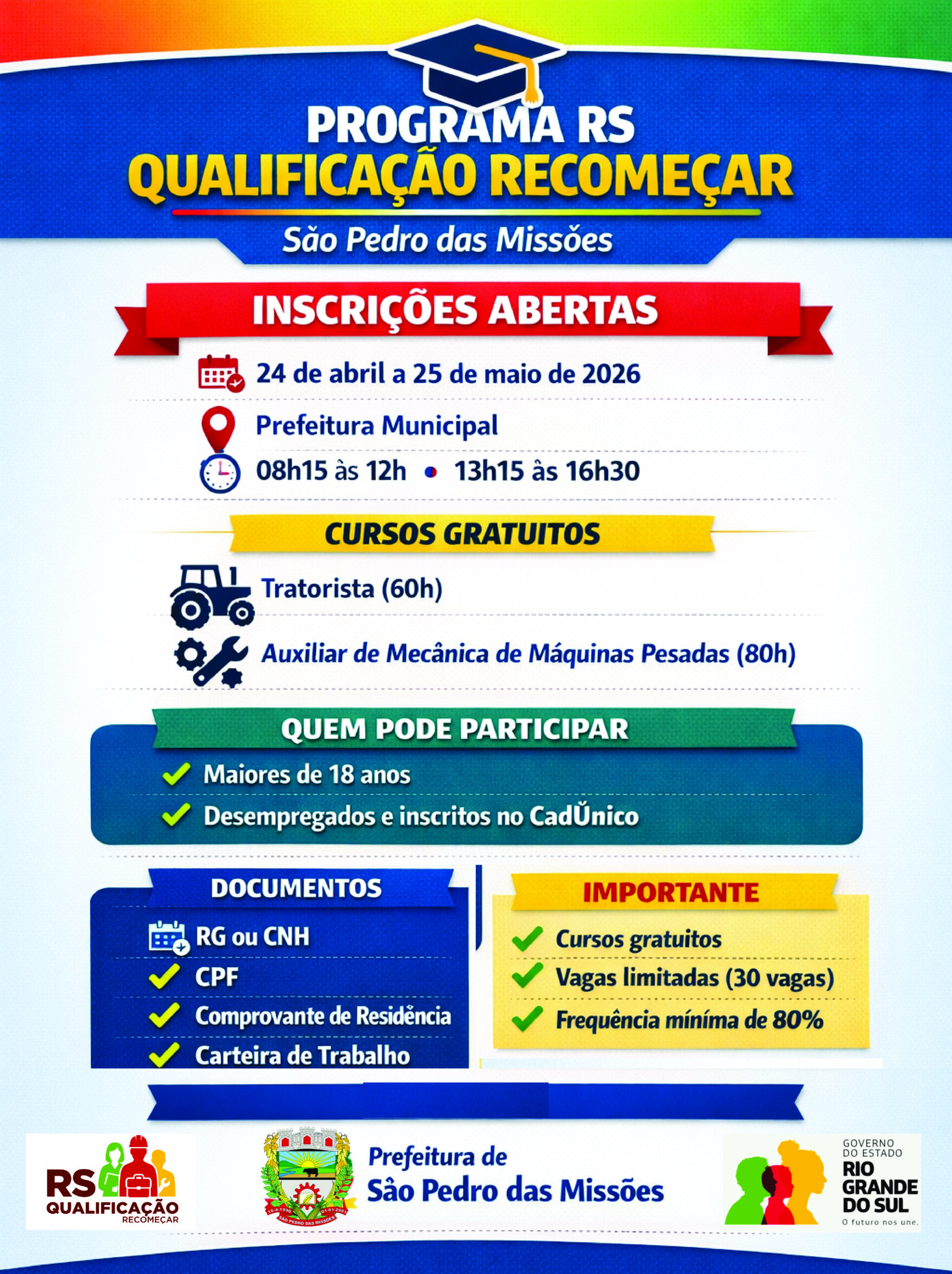 A Prefeitura de São Pedro das Missões abriu o Processo Seletivo para ingresso nos cursos de qualificação e capacitação profissional do Programa RS Qualificação Recomeçar. O programa é um convênio com o Estado do Rio Grande do Sul, por intermédio da Secretaria de Trabalho e Desenvolvimento Profissional – STDP.